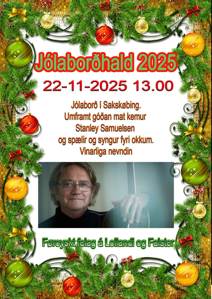 Jólaborðhald 2025 9. oktober 20259. oktober 2025 Føroyskt felag á Lollandi og Falster. Ingen kommentarer Sted: Maltrup Vænge 38, 4990 Sakskøbing Her kunnu tit tilmelda tykkum tiltøk í okkara felag Tilmeldingsdato.....: Navn...............: Mail...............: Mob................: Antal persónar.: 123456789 Vel tiltak.........: Vel tiltakSiglitúrurJólaborðhaldAðalfundurNevndarfundurRastkjøtaveitslaRæstan fiskSummarútflugtTúr á FemerenSiglitúrur Naka upp á hjarta skriva tað her: ______________________________ Sikkerheds spørgsmål Hvor mange ben har en hund Send...............: Δ Tú kann eisini kan ringast til ein av nevndarliminum Δ Følg os på facebookTweetSkriv til osFølg os: Henda síðan er víst 52 Share this: Click to share on Facebook (Opens in new window) Facebook Click to share on X (Opens in new window) X Like this:Like Loading... Anna nýtt